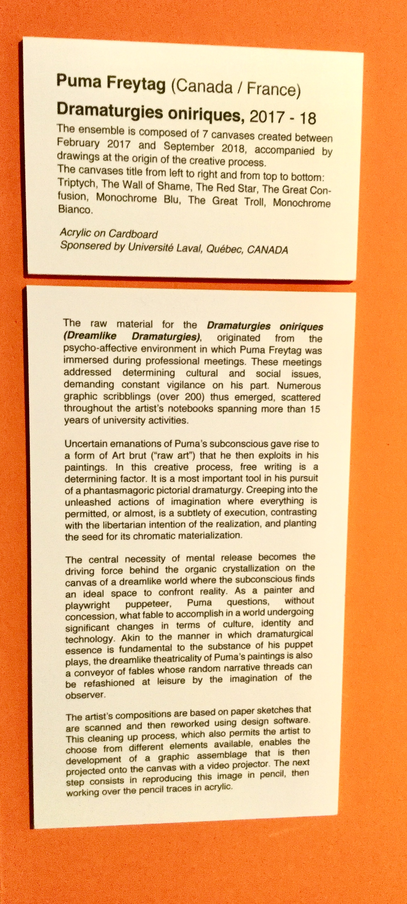 Aujourd’hui, nous pouvons constater certaines analogies entre le monde des Futuristes et le nôtre, comme la fascination pour la modernité technologique ou l’inquiétante montée d’un populisme identitaire. Comme artiste immergé dans sa société, c’est de cette réalité complexe et contradictoire que je voudrais rendre compte tant dans mes œuvres picturales que théâtrales. Mes nouvelles pratiques artistiques s’inscrivent donc dans un projet plus vaste visant à un atypique rapprochement entre la dimension théâtrale marionnettique et l’espace muséal contemporain des arts visuels.