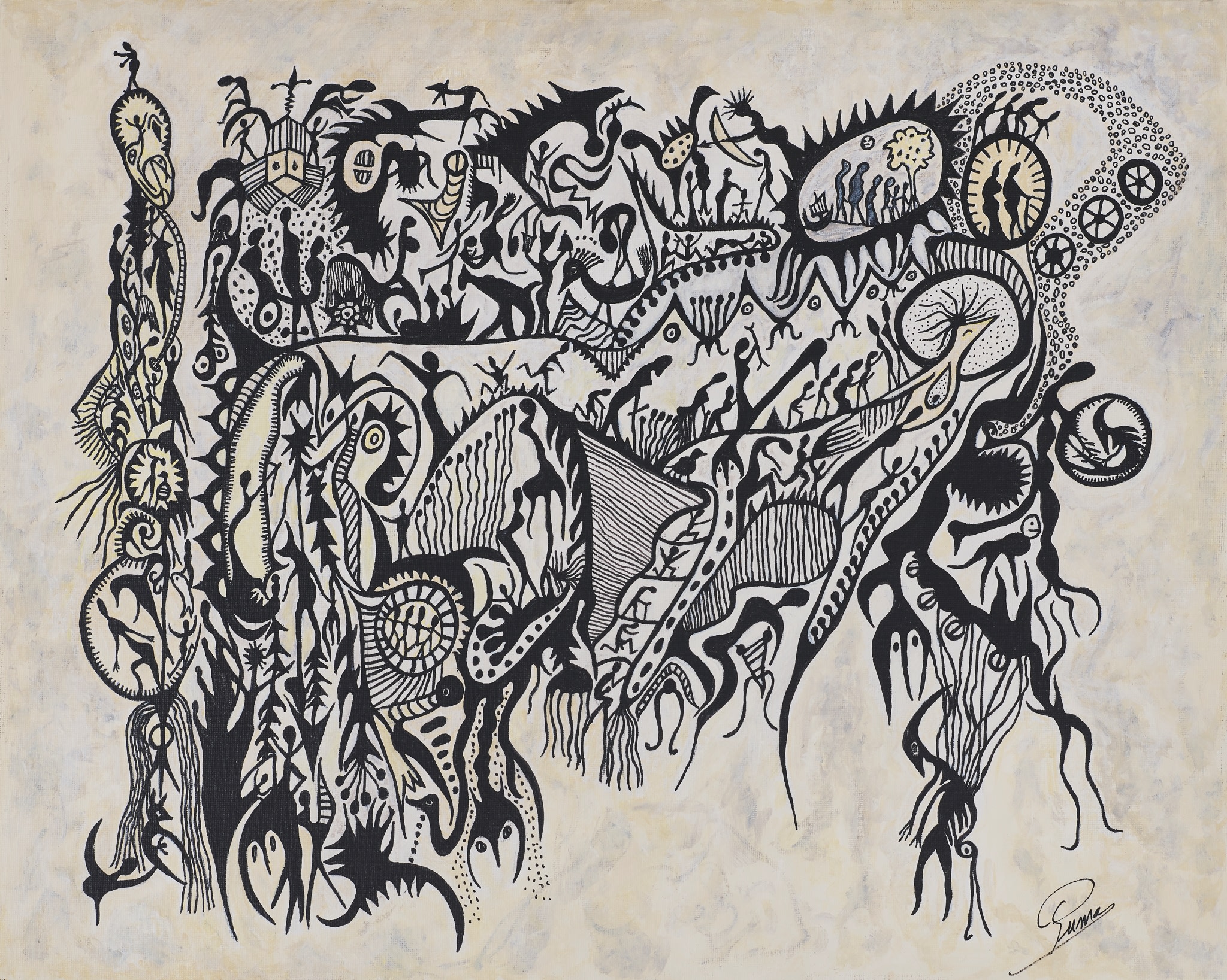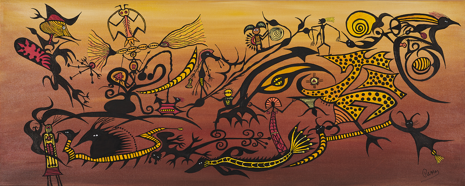 Divagations préhistoriques, 2020, Acrylique sur toile, (40 X 16 po) 40,64 X 101,6 cm (H x L)